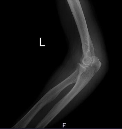 下記の患者さんは、肘頭骨折と言って肘関節での骨折です。