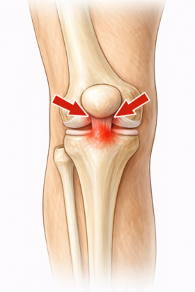 膝のお皿からスネにつながる「膝蓋靱帯」に強い力が加わることで起こります。